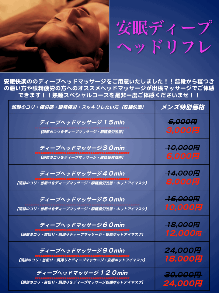 また、深いリラクゼーションが得られるので慢性的にお疲れの方にもおススメのメニューです。肩こり、片頭痛の方、パソコンの使用で目が疲れている方、ストレスの溜まっている方、すぐにリラックスしたい方など、出張マッサージ東京アネワではボディプランのオプションとして大変人気があります。